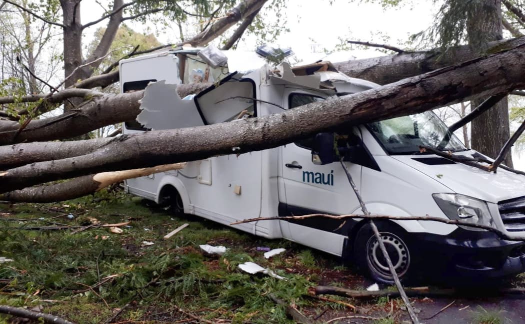 Justin Wealleans said he, his wife Ine and their sons Niko, 6, and Casey, 4, of Christchurch, were spending the night in the rental vehicle at a lakeside reserve just north of Kingston when the tree came down during violent winds about 2am.