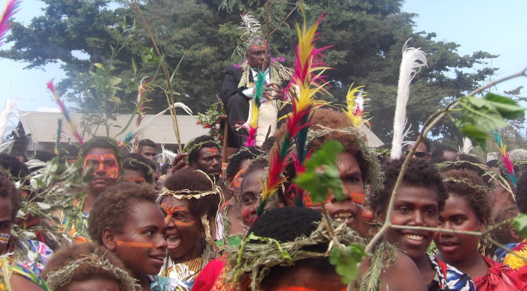 Dancers carrying Mr Tallis to the stadium. Photo: Vanuatu Daily Post / Len Garae