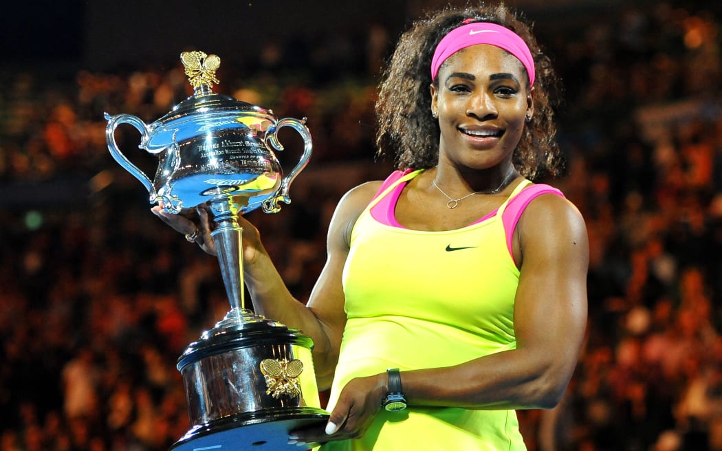 Serena Williams poses with the Australian Open trophy for the sixth time Photo: Photosport